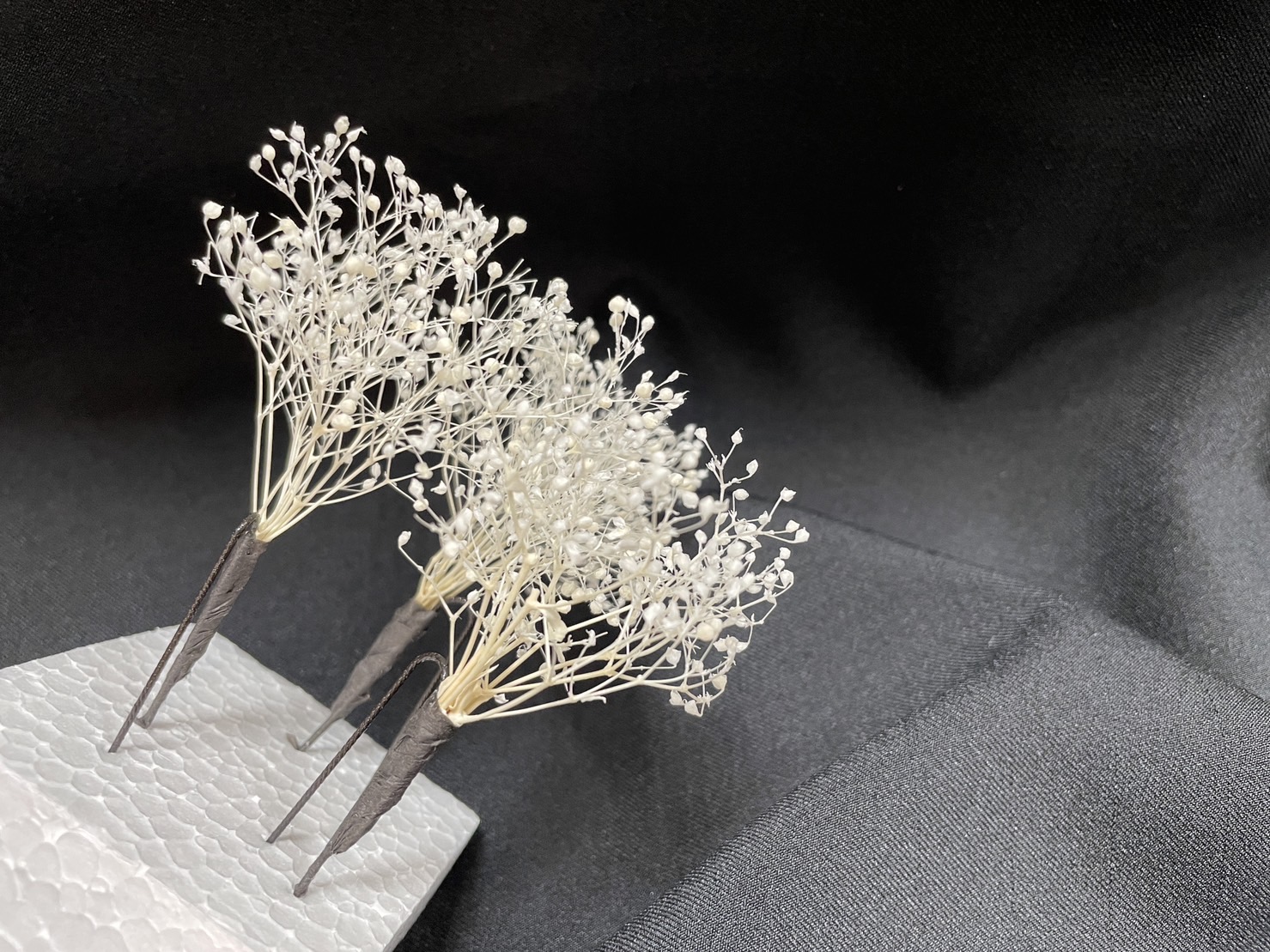 かすみ草に限らず、ドライフラワーの髪飾りは人気のモチーフ。