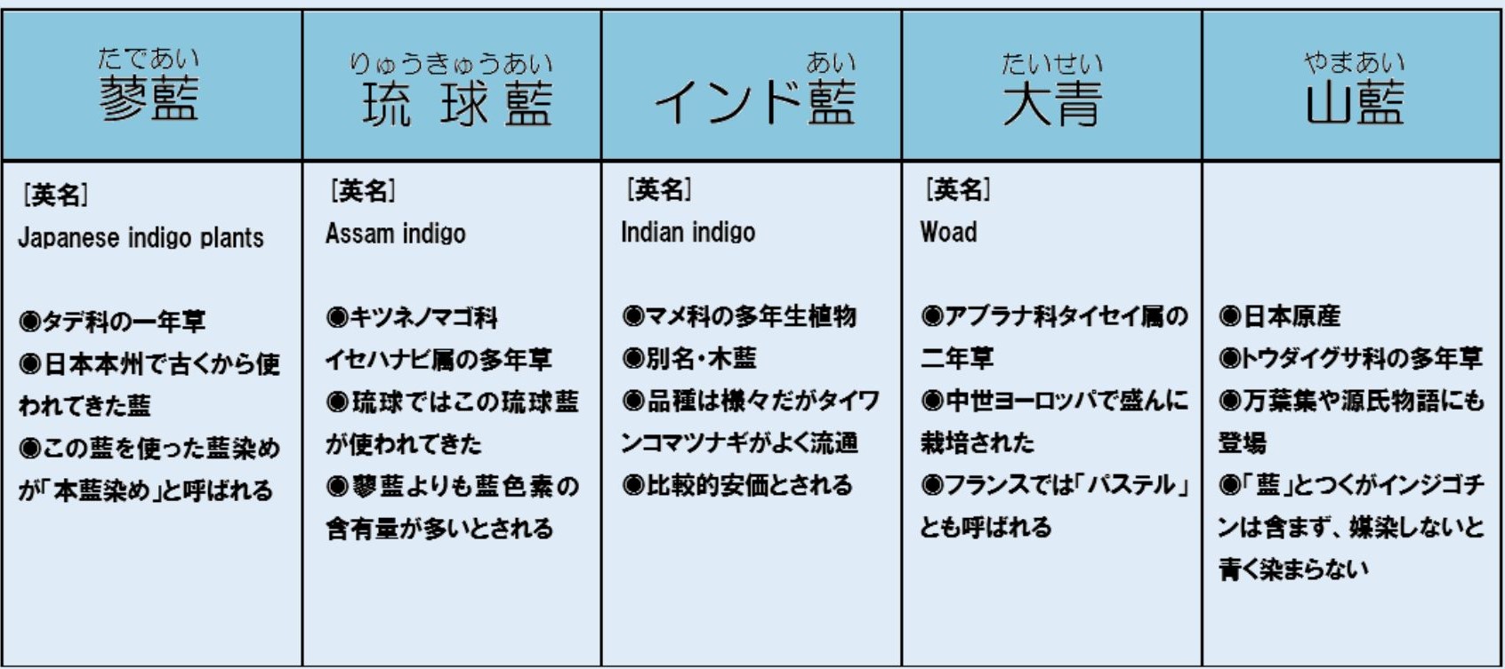 日本や中国などで使われるタデ科の蓼藍(たであい)、インド原産のマメ科のインド藍、主に沖縄で使われるキツネノマゴ科の琉球藍などその種類は様々。