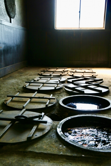 藍をためておく藍甕(あいがめ)に蒅と灰汁、石灰、酒などを入れて混ぜます。