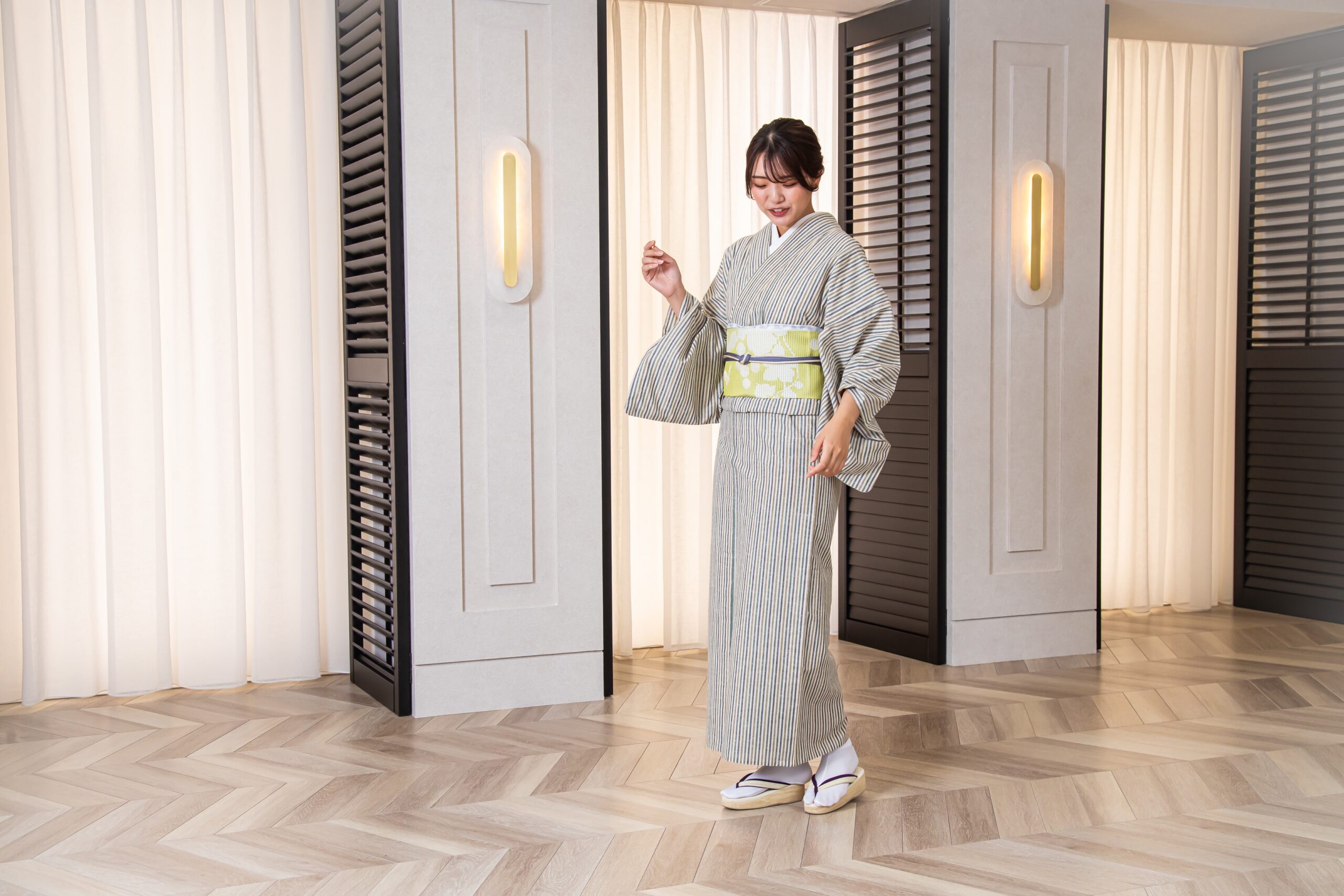 ストライプや無地のコットンワンピースに近い感覚でさらりと着物を着こなしたい方におすすめ。