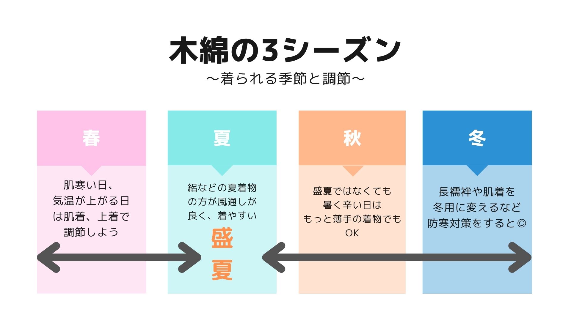 その点、1年を通して単衣で着用OKな木綿の着物は心強い味方です。