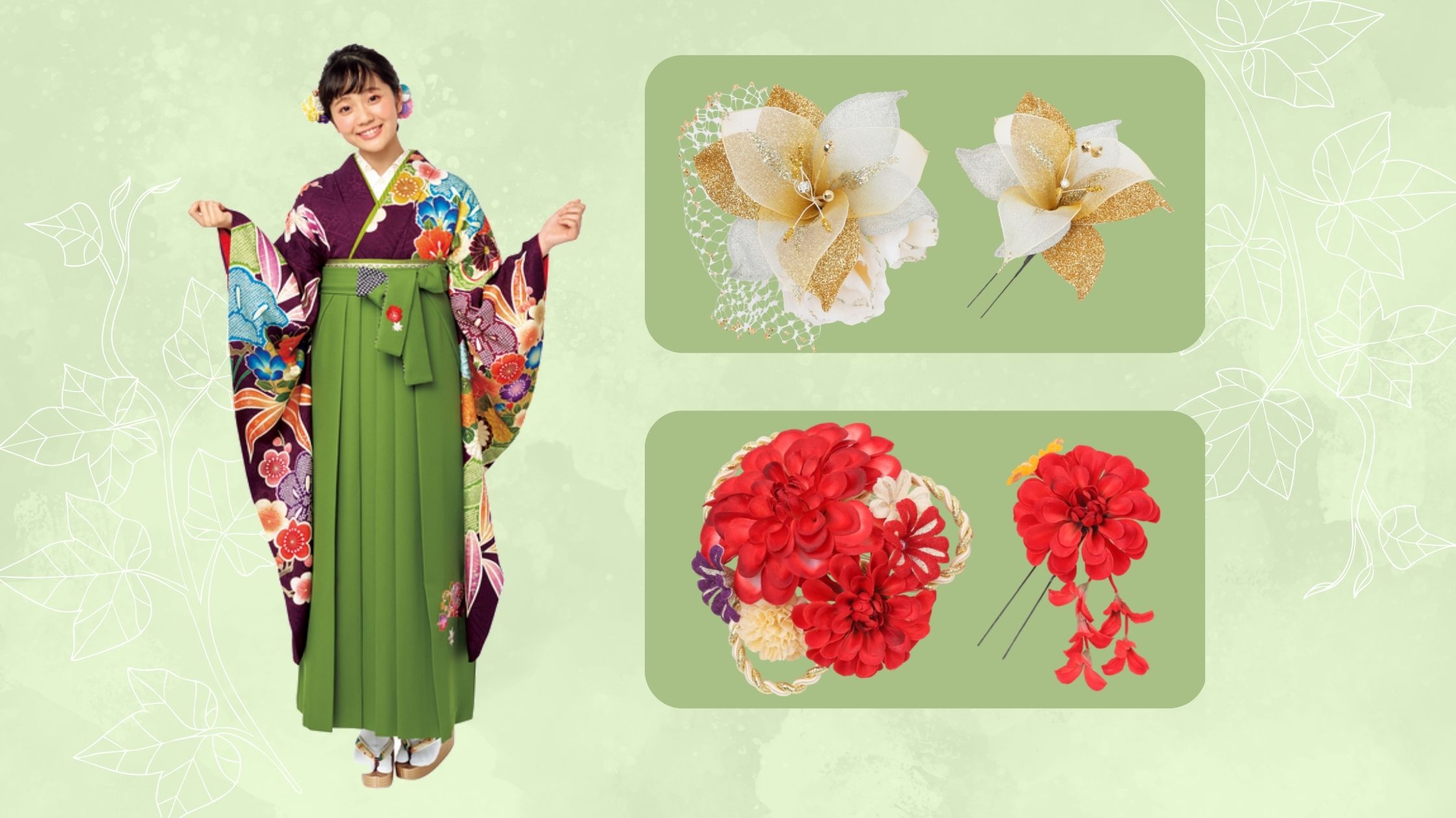 バッグや髪飾りなども上手に使うことで、袴姿をより華やかに演出できます。