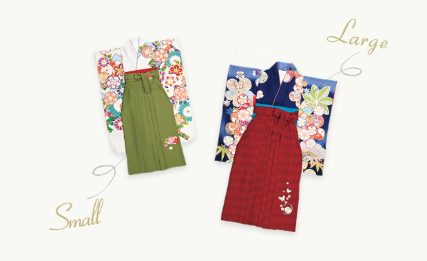 着付けや体型にもよりますが、特に身長165cm以上の方は一番大きなサイズの袴でないと足首が見えて小さく感じてしまうことが多いようです。ご自身の身長も考慮して、小さめの方・大きめの方は早めに袴の予約を抑えておいたほうがご安心でしょう。