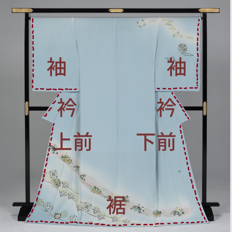 しつけのかかっている場所は以下のように点線で示している部分で、両袖、衿、上前~裾~下前にかけてしつけがされています。