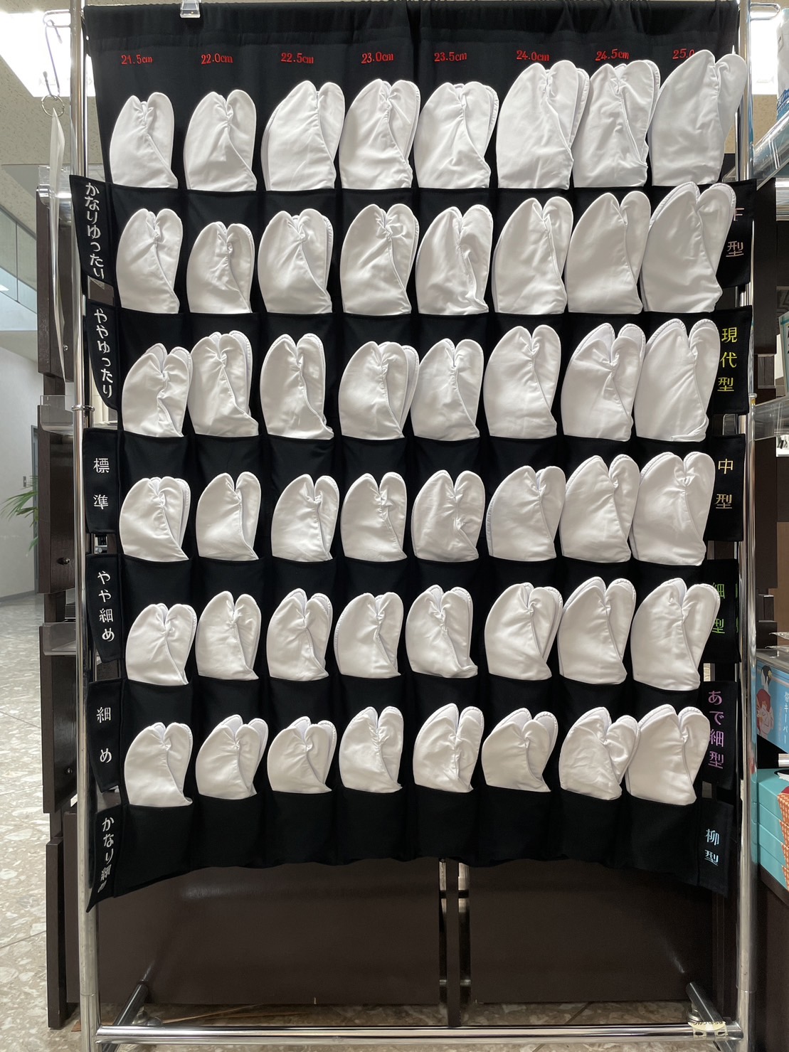 例えば、23.5cmの足袋でもゆったり~ほっそりまで6タイプあり、自分にピッタリのサイズを 試着 して見つけて頂く事ができます。