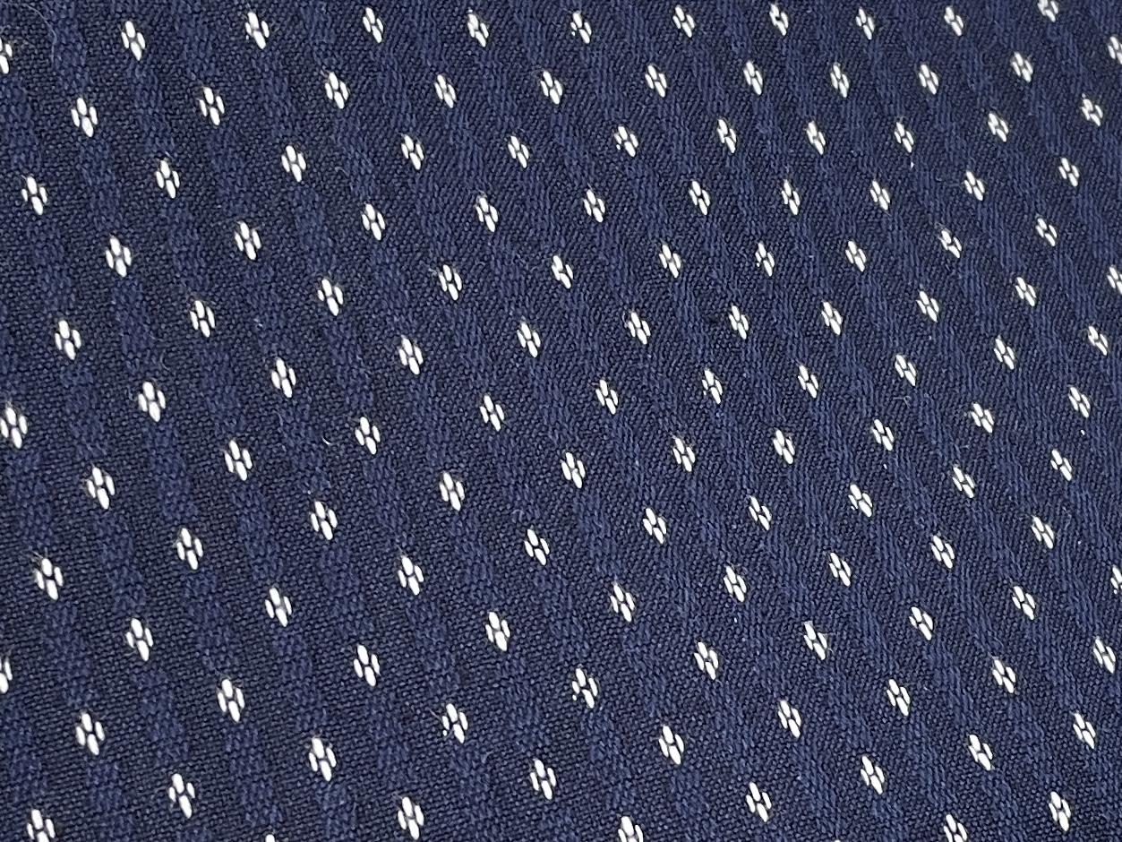 藍色の生地に白の細かい絣模様、温かみのある木綿の風合いと生地の丈夫さが特徴です。