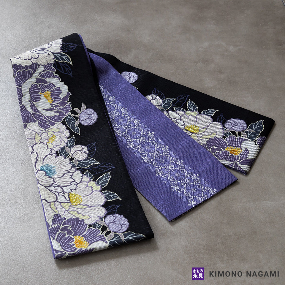 袋帯と同じように表地と裏地を縫い合わせて作られていますが、長さは名古屋帯と同じなので一重太鼓で結びます。前太鼓の幅を自由に変えられるので、少し幅を広く結んで立派な雰囲気で装うこともできる便利な帯です。