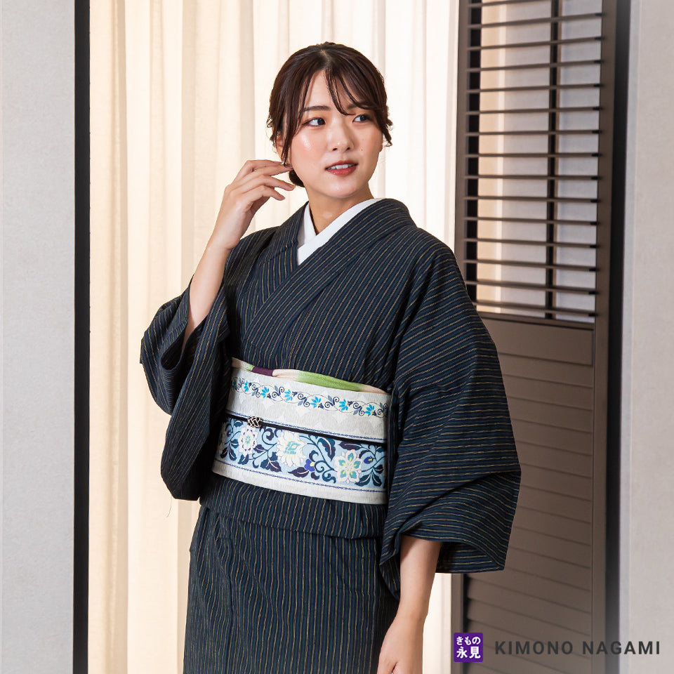 名古屋帯(なごやおび)は、カジュアルからセミフォーマルまで使用できる万能な帯です。袋帯の次に格の高い帯で、素材や柄によって小紋や紬といった普段着の着物から、付け下げや色無地のような少しあらたまった準礼装にも適しています。