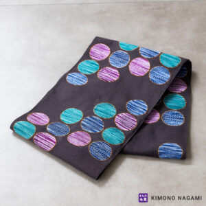 サイズは幅約31cm、長さ約4m20cm以上あり、表地と裏地を縫い合わせた「袋状」になっていることが名前の由来です。染めの袋帯や金銀糸ではなく色糸で織られた「洒落袋」と呼ばれる帯は、小紋や紬などの普段着の着物にも合わせられます。