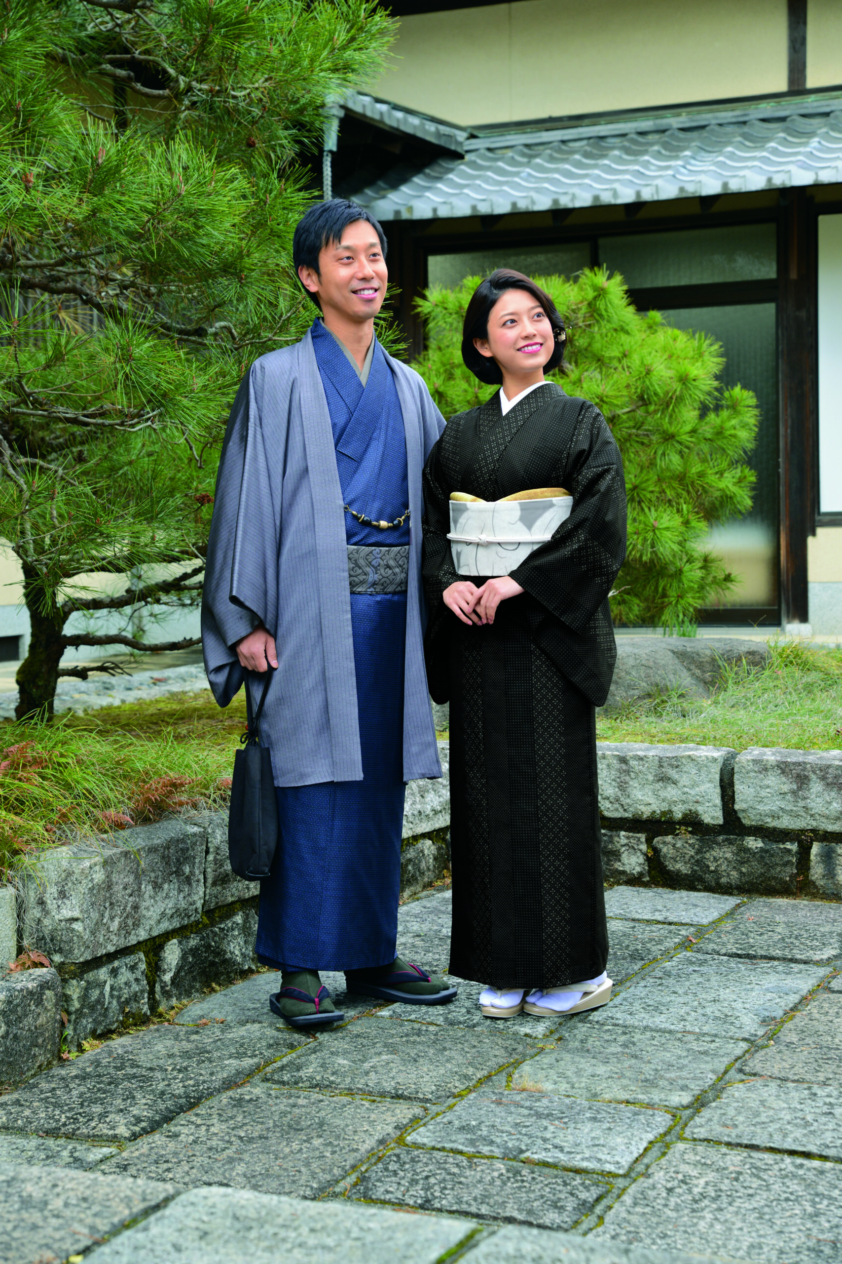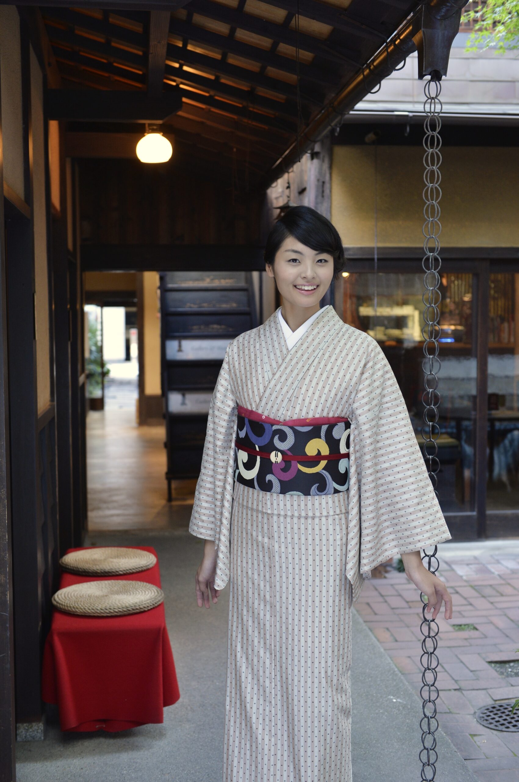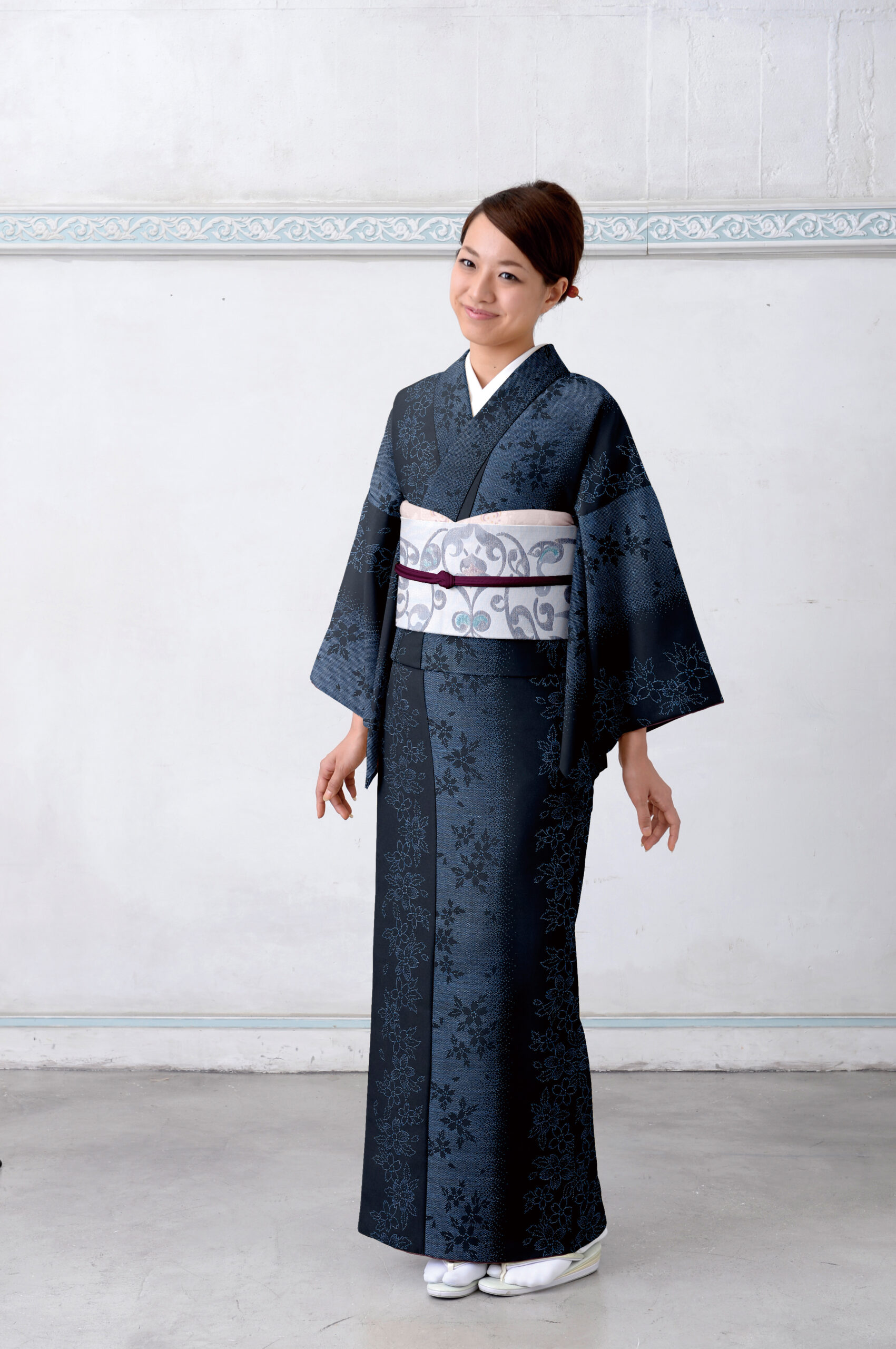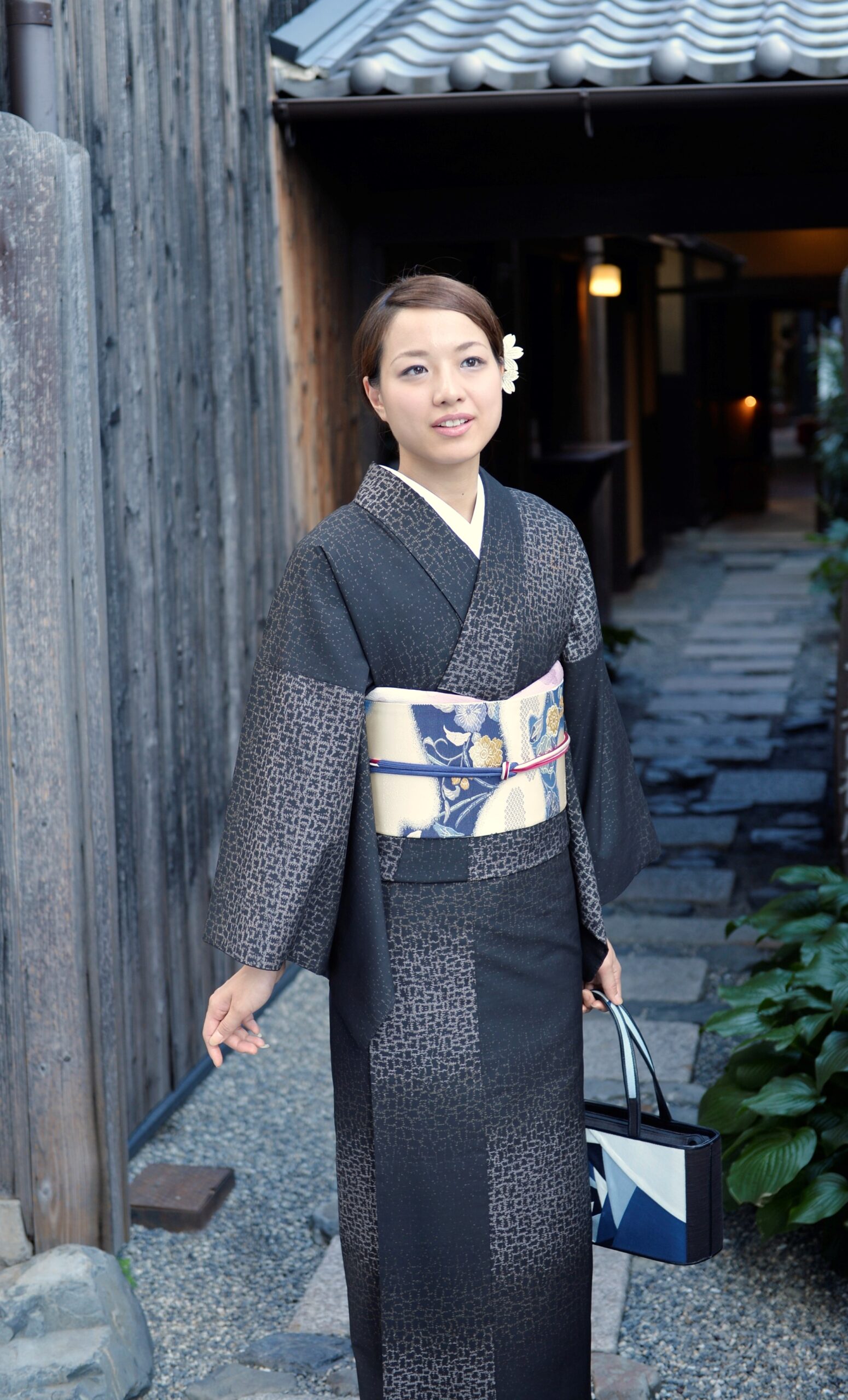 京都の石畳を思わせるような、シンプルで颯爽とした印象の大島紬。爽やかな白の帯でスタイリッシュにコーディネートされています。