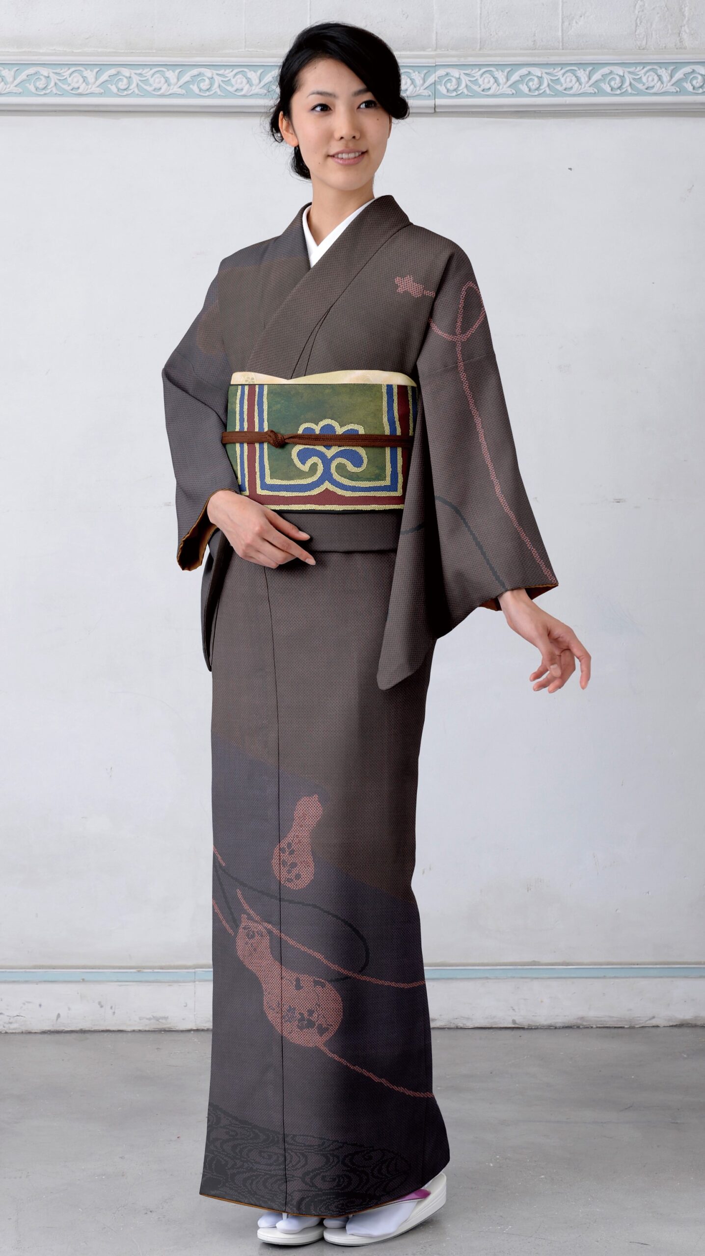 演技のいいひょうたん柄を袖と裾模様に配したシックな大島紬。一度染めた糸を部分的に抜染して模様に立体感を持たせた訪問着です。帯や小物もトーンを落ち着かせて、都会的かつ個性的なおしゃれな雰囲気が醸し出されています。