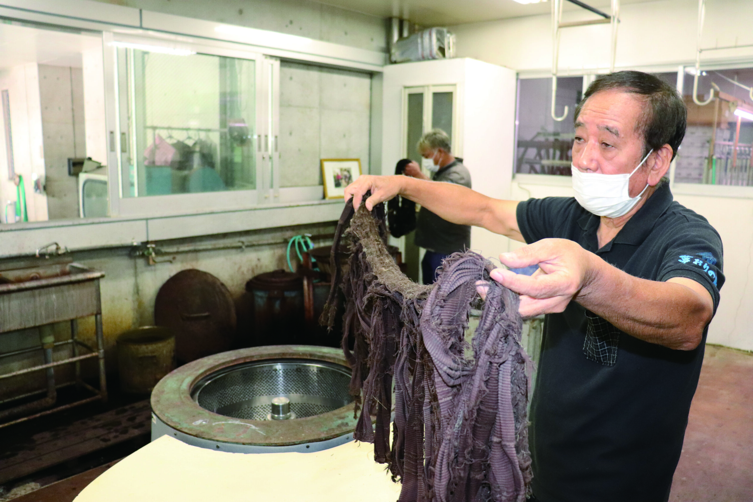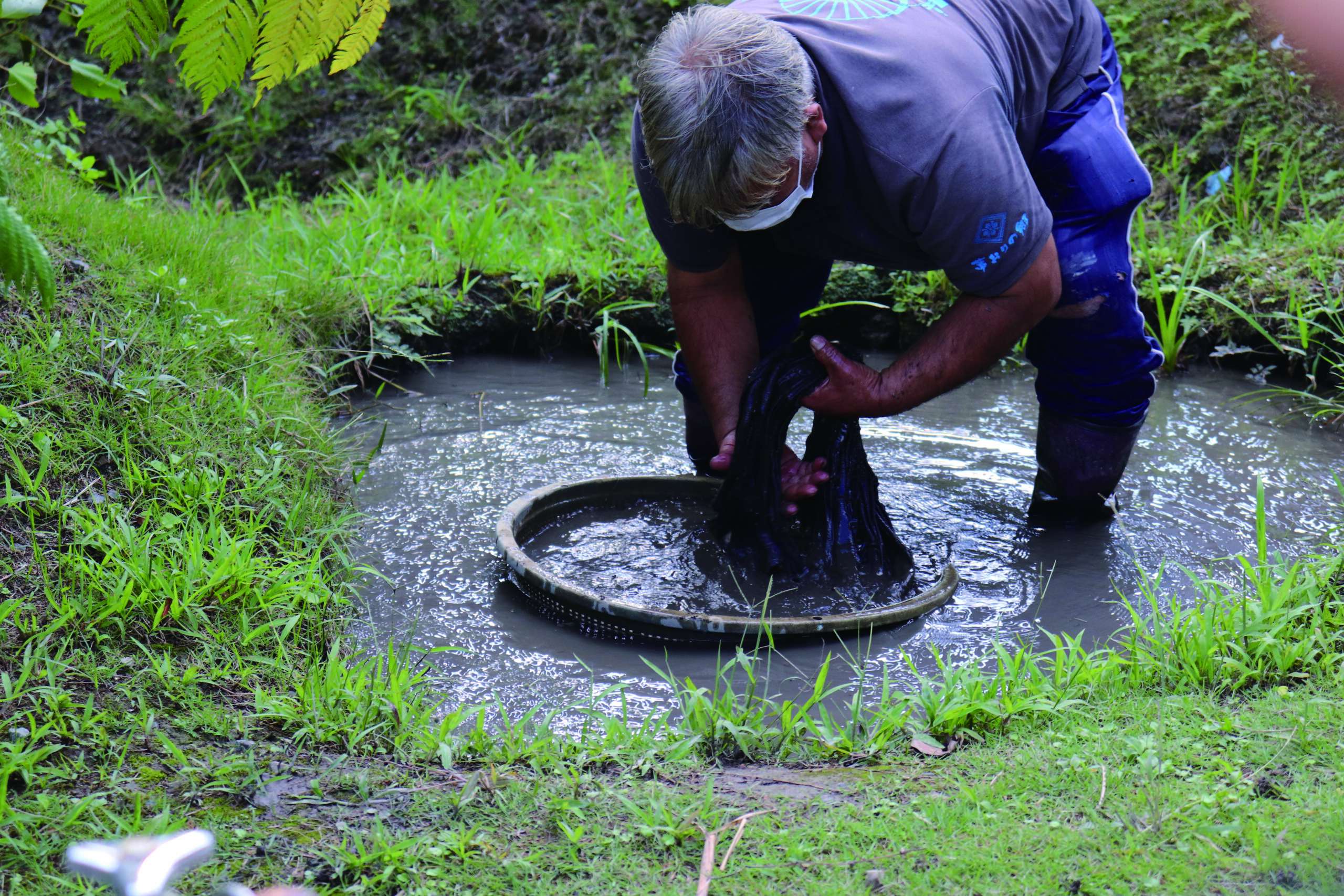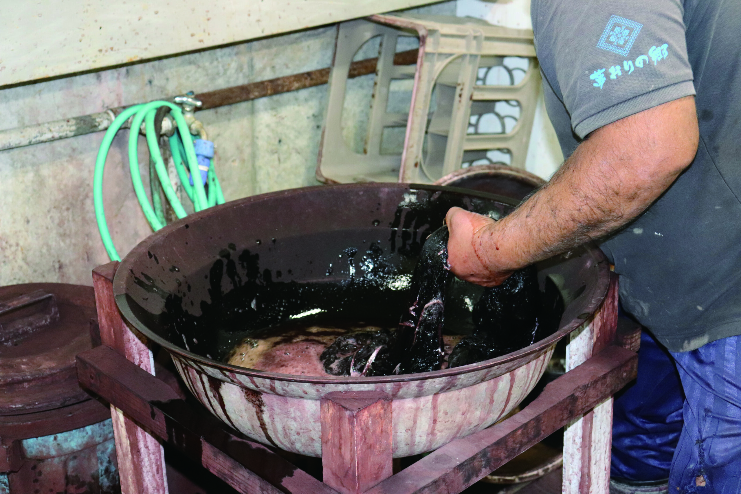 ▲漆黒の色を求めるには車輪梅で20回ほど染めては干して染めては干してを繰り返してその後泥田で媒染といった工程を繰り返す必要があります。
