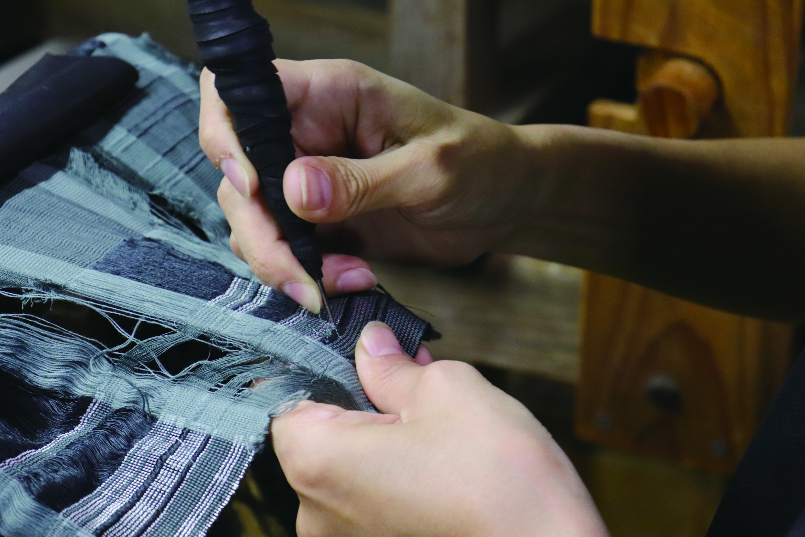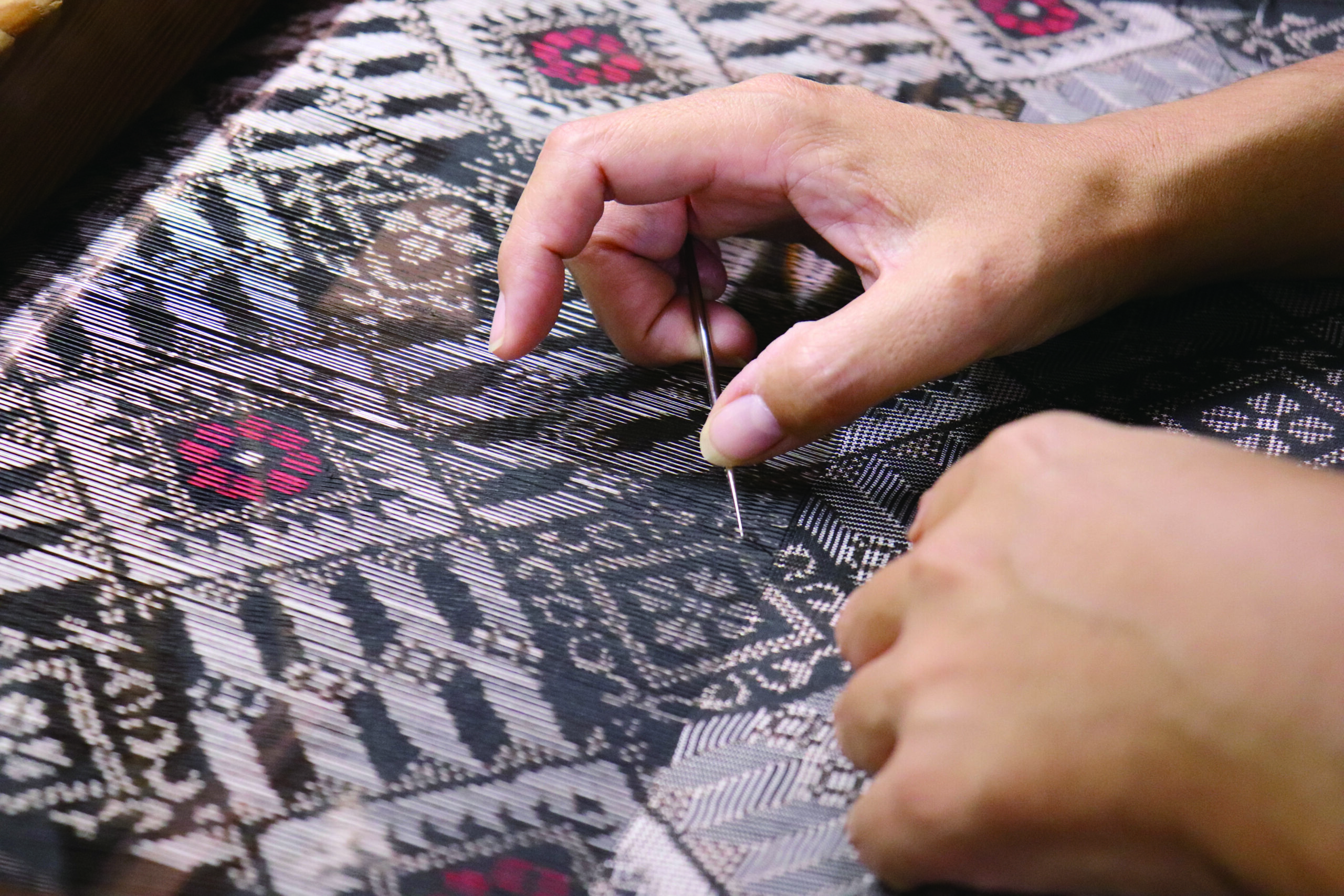 1~2センチ織り進んでは機を止め、手に縫い針を持って絣のズレを修正します。
