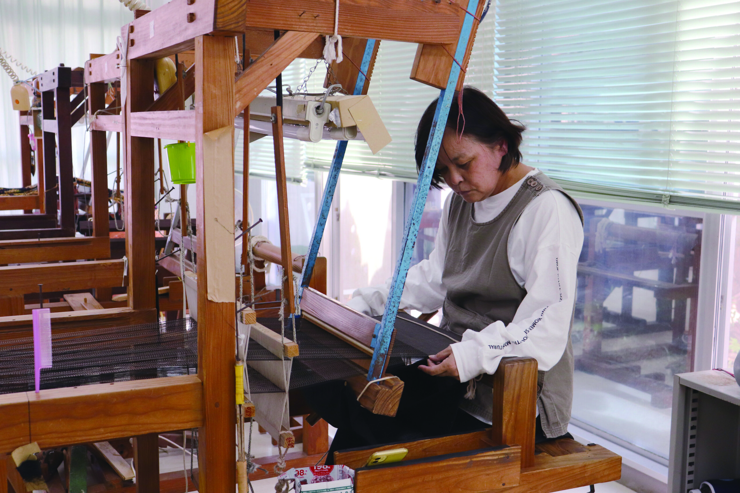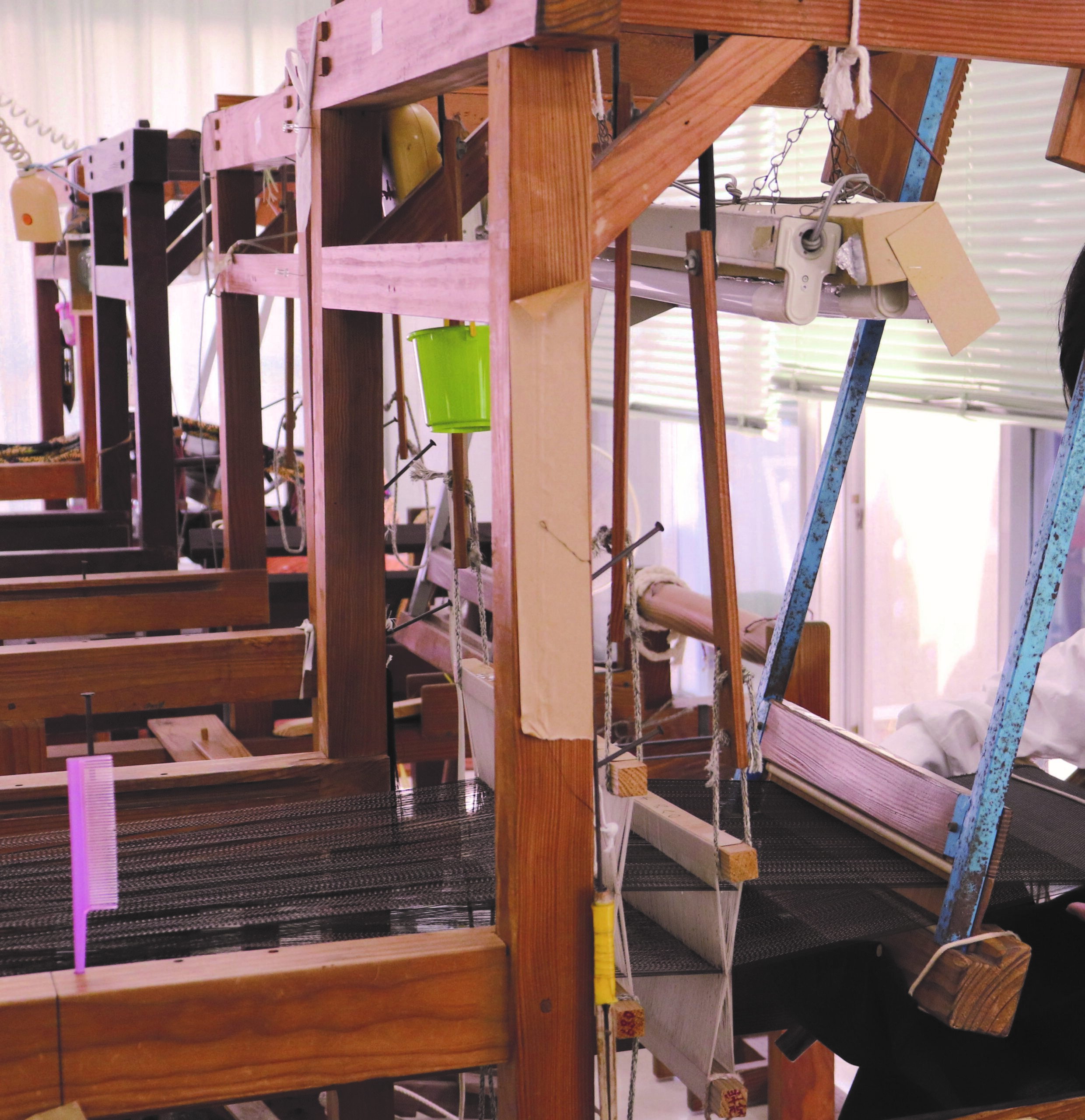このように、数センチ織り上げては針で絣のわずかな狂いを調整する「絣調整」を繰り返しながら、1日10センチ程度織り進め、数ヶ月かけて織り上げます。