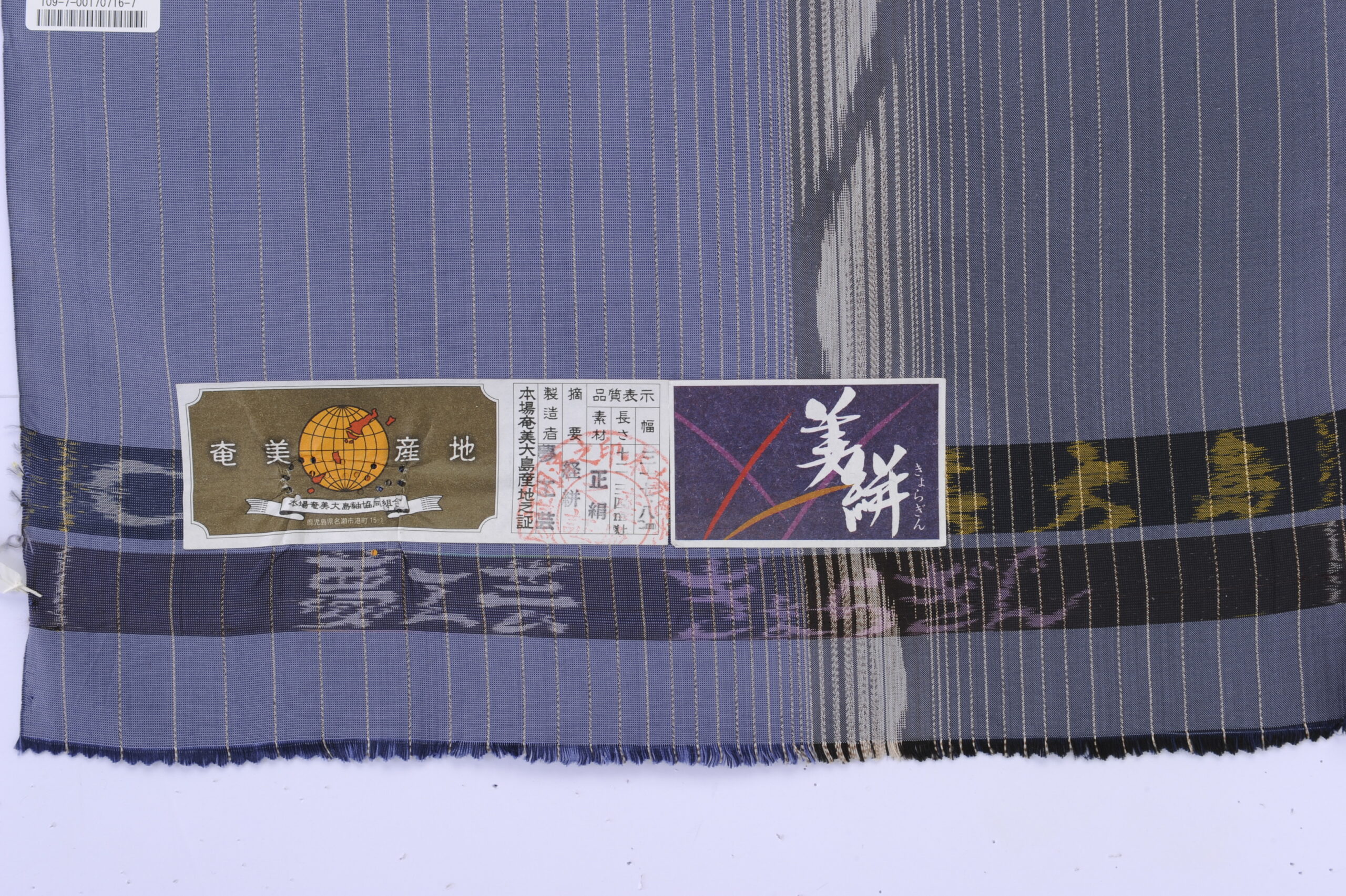 手織りの鹿児島産の青色の「旗印」と呼ばれる証紙が貼られています。鹿児島県で織られた本場大島紬の証紙の左上の横には「織絣」という捺印があります。