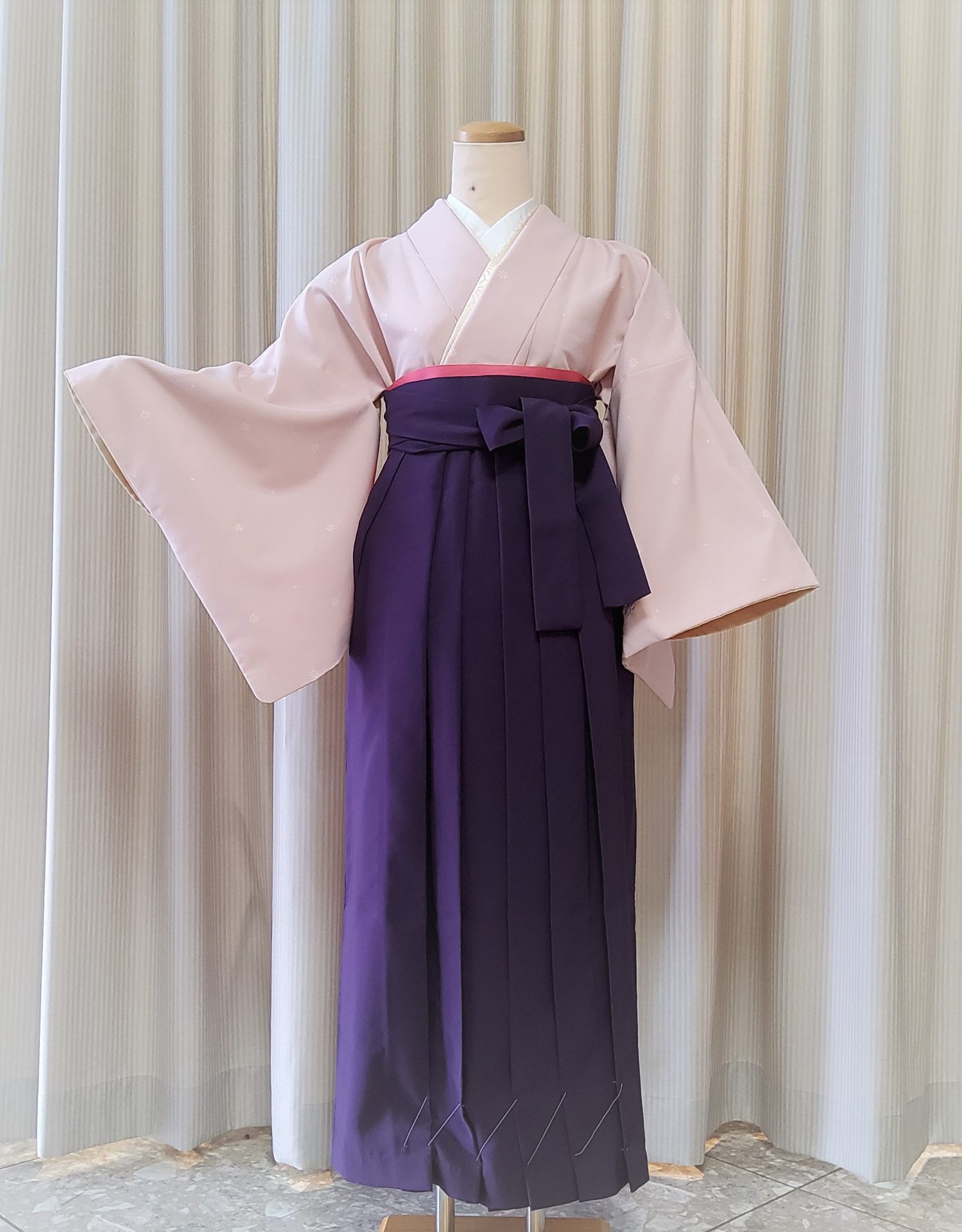 ▲桜色の色無地に紫の無地の袴スタイル。生徒を送り出す先生らしく、落ち着きつつも春先にピッタリの優しい色合いのコーディネートです。