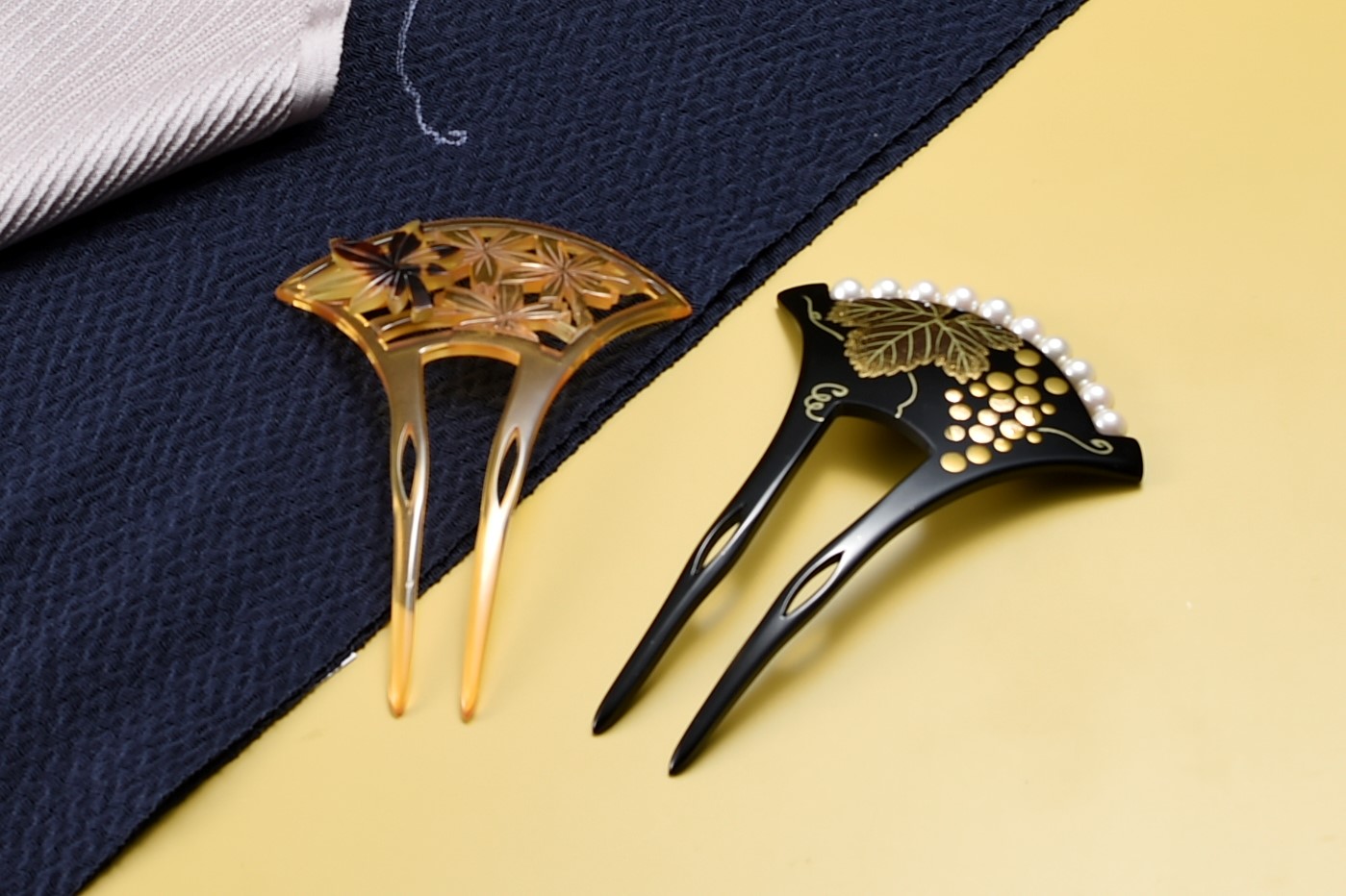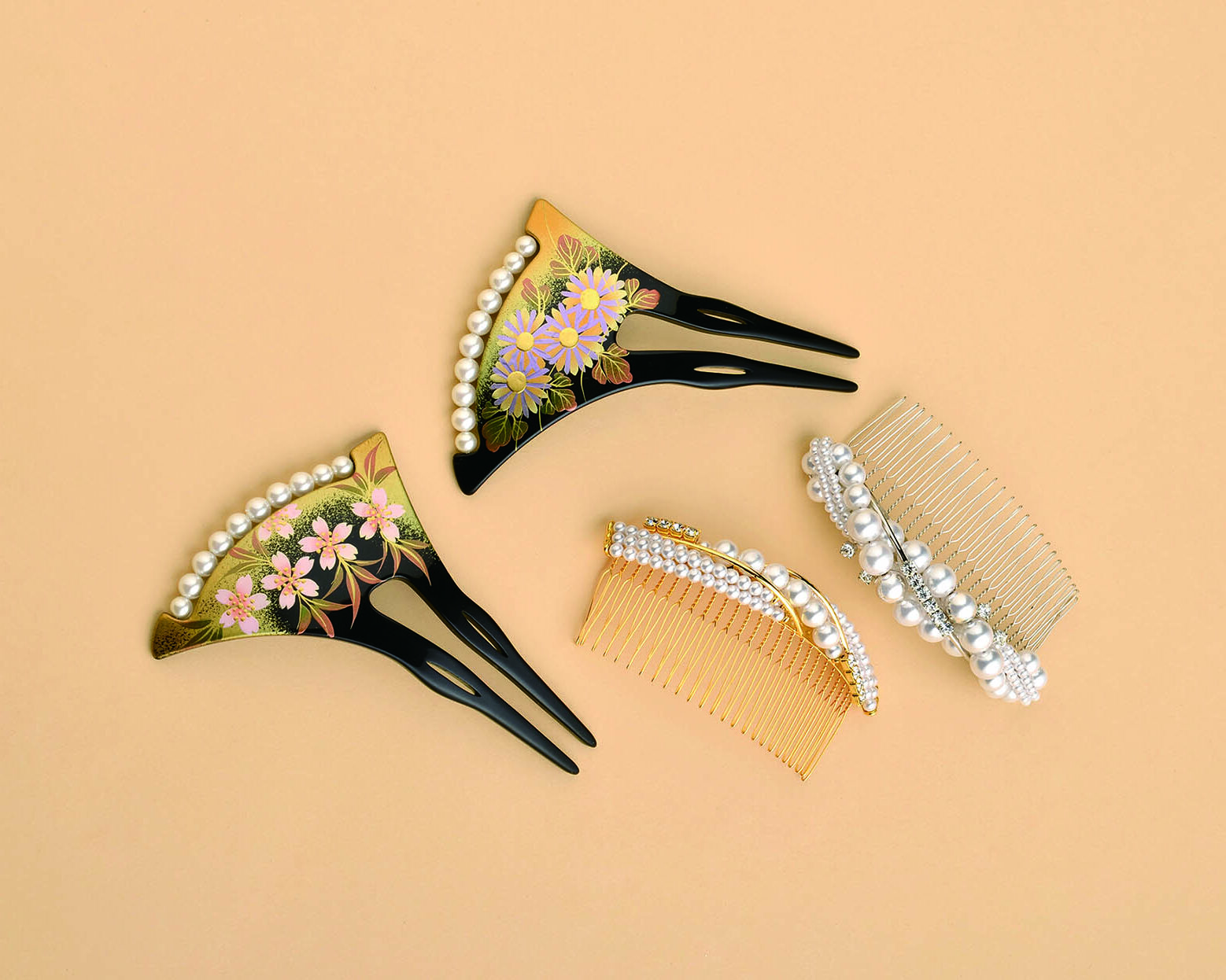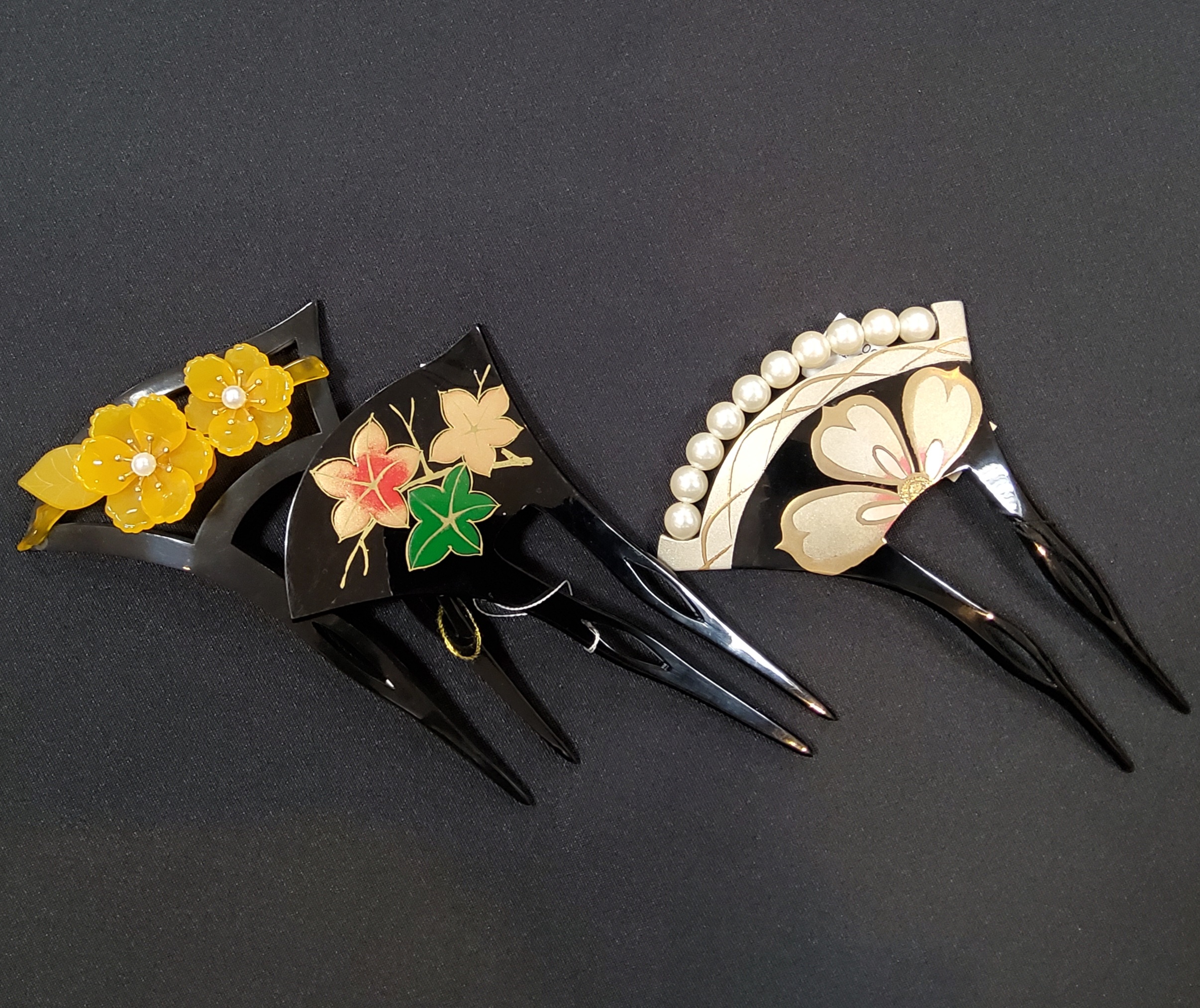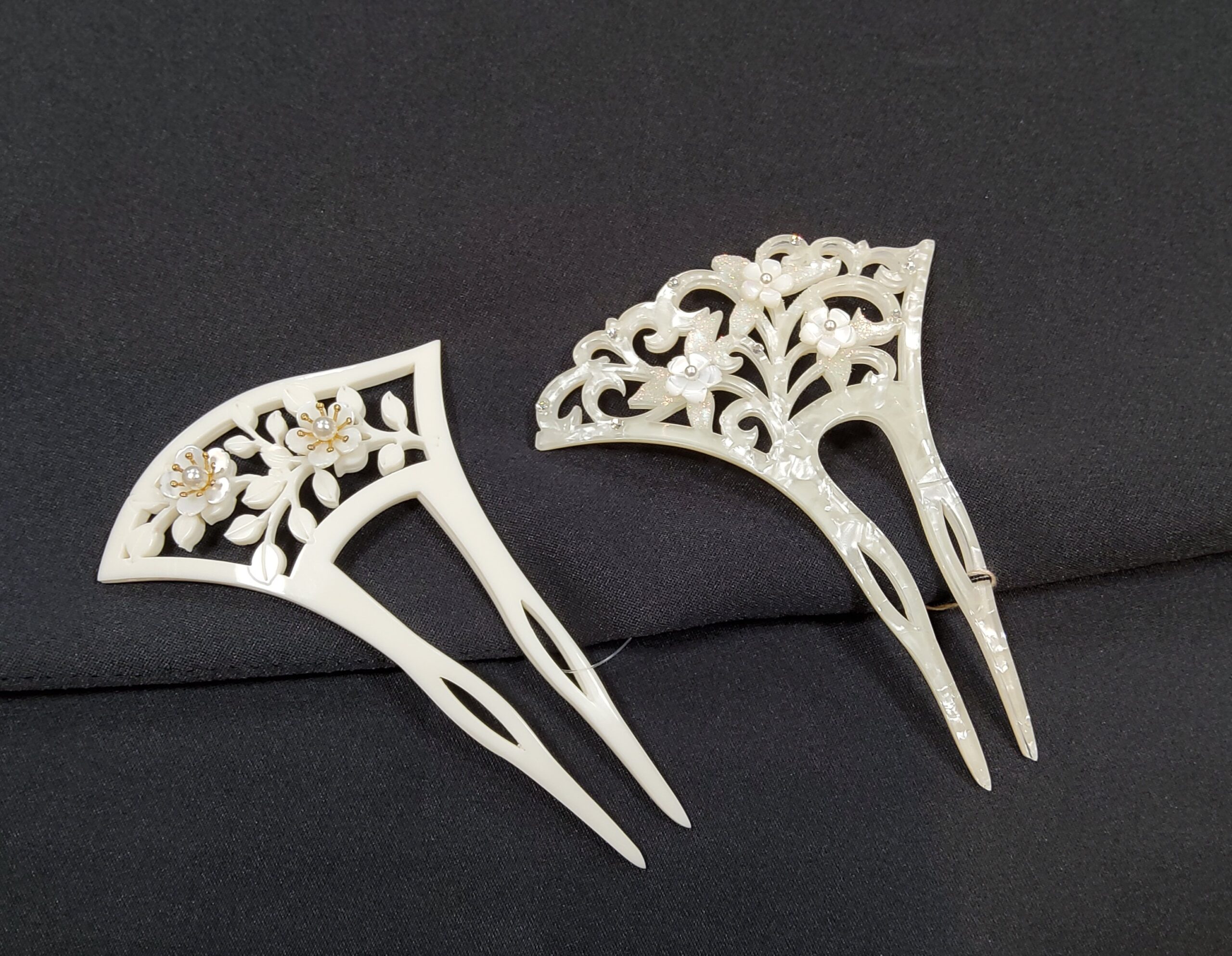 黒留袖によく合う髪飾りとして人気が高いこのタイプ。螺鈿を施したり、パールをあしらったりとデザインも様々。ブラックやダークブラウンなどの髪型によく合います。