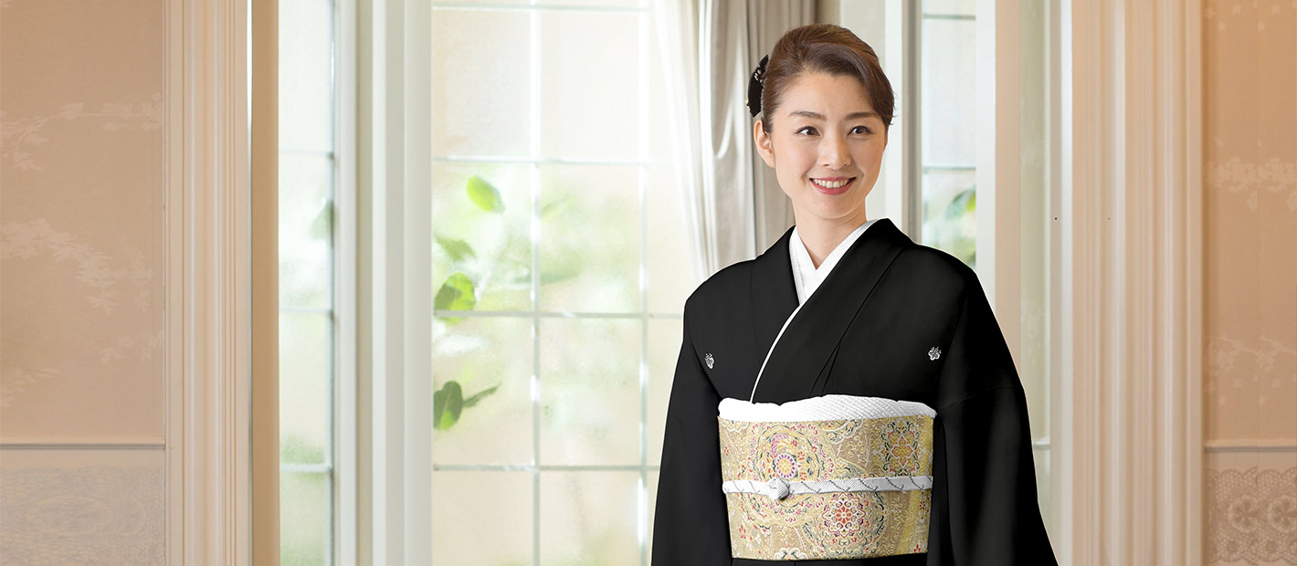 息子さんや娘さんが結婚される際、お母様の立場の装いとして着るのが黒留袖。また、新郎新婦のご親族や仲人婦人も着用される、ミセスの第一礼装の着物です。